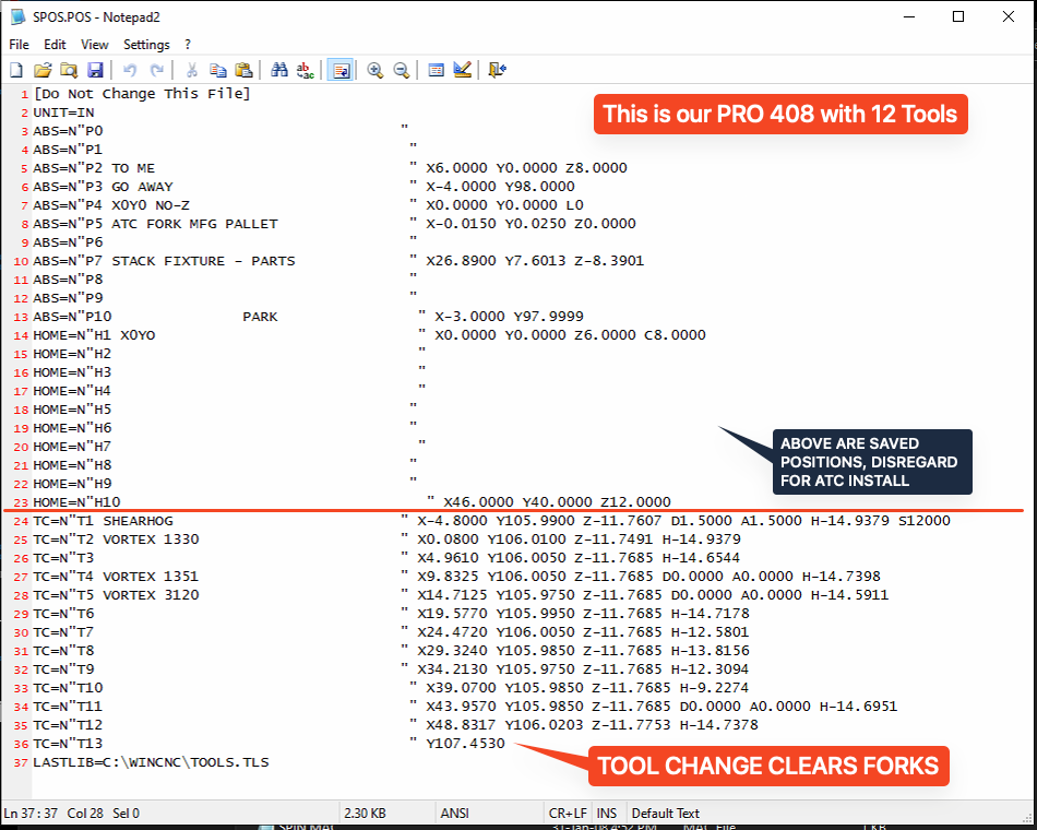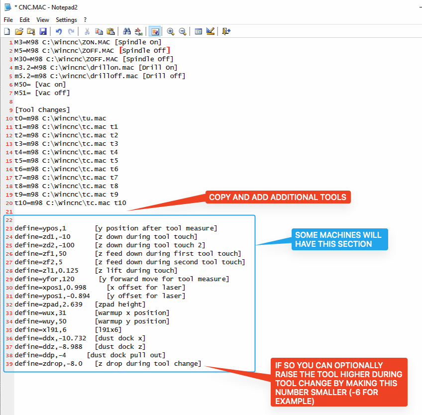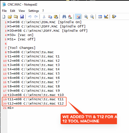 - Open the CNC.mac file and add T# positions