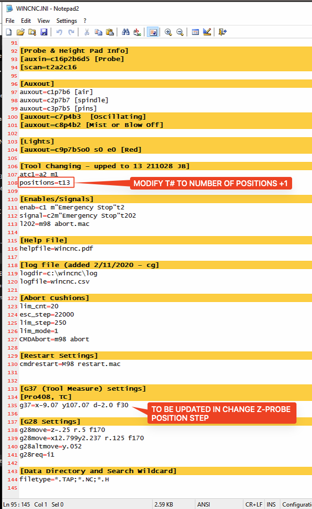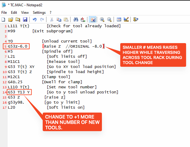 - Optional but suggested - to raise your tool higher while traversing across the rest of the tools in X during a tool change, make the G53z-N number smaller. We changed ours from -8 to -6.